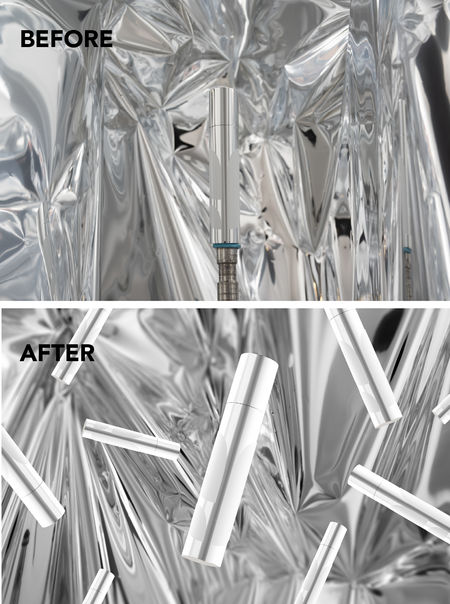 One of my most challenging shoots - an all chrome tube of mascara! This was shot all in studio. Lots of editing work in post, but I love how they turned out. The red was a nod to the actual packaging of the product as the inside carton was red. Check out the before and after comparison to see the magic!